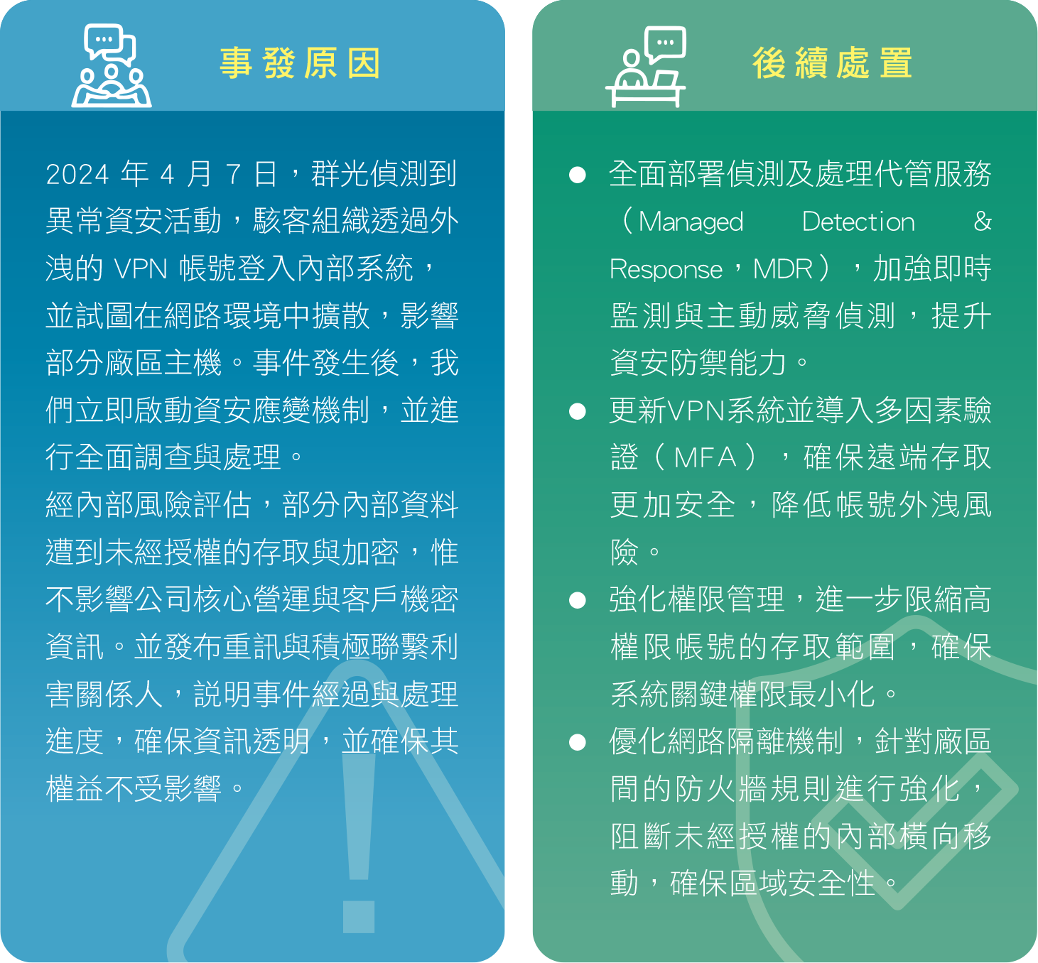 群光對資安事件高度重視,不僅確保即時應變與損害控管,也積極落實資訊安全管理,以維護客戶信任與企業營運穩定。