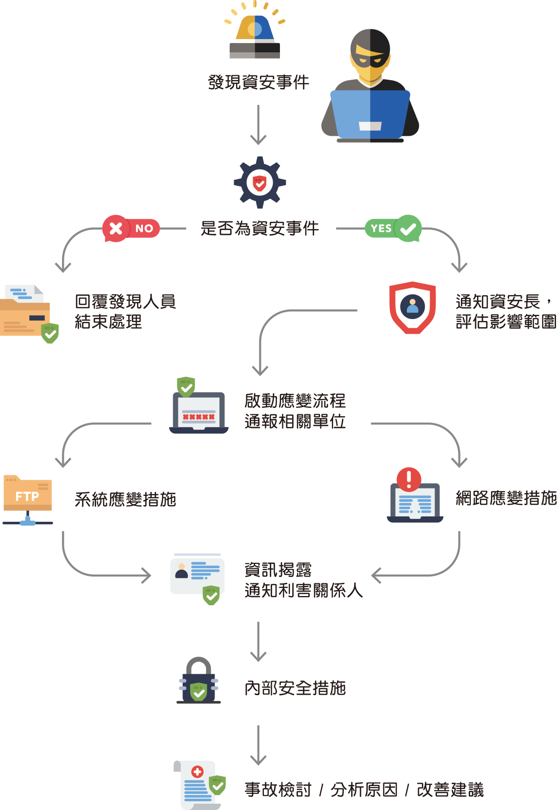 當資安事件發生時,立即啟動應變機制,處理過程涵蓋網路與系統層面的應變措施,並同步進行鑑識與證據保存。我們高度重視資訊透明與法規遵循,事件發生時通知利害關係人與法務單位進行風險評估,並依政府規範發佈重大訊息。也持續提高內部員工警覺性,發現異常時應立即斷網關機,並尋求集團電腦中心支援,避免進一步損害。
