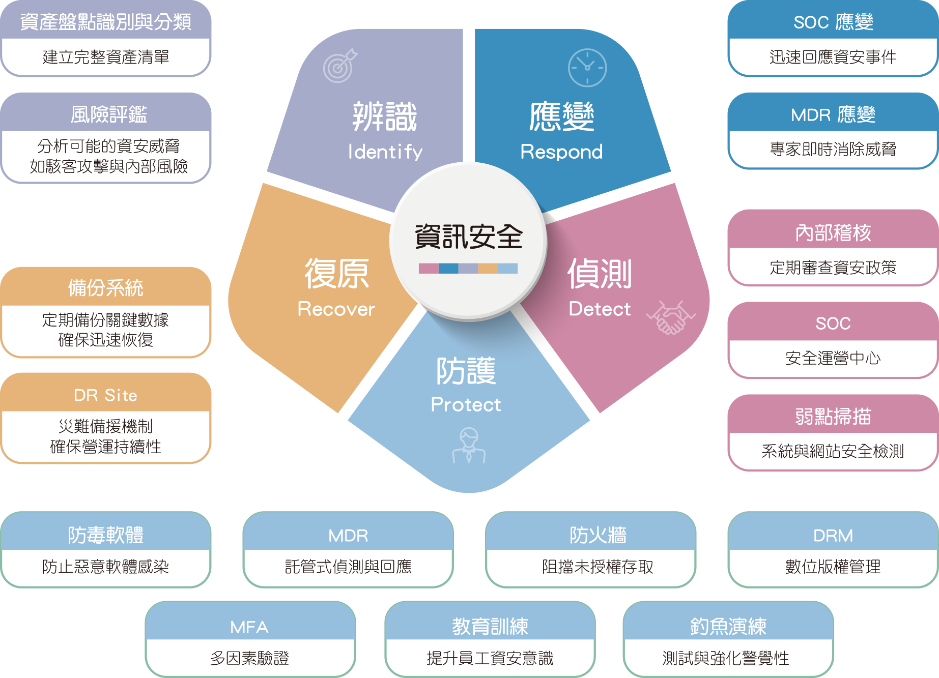 為確保公司資訊安全,降低潛在資安風險,我們依循國際標準與最佳實踐,建構全面性的資安管理架構,參考ISO 27001資訊安全管理系統(ISMS)及美國國家標準與技術研究院(NIST)網路安全框架之五大領域進行落實,確保企業內部與外部的資安風險能夠有效控管。