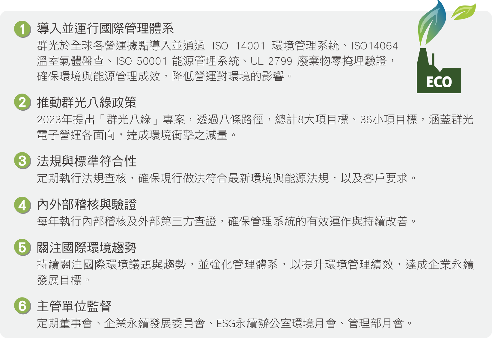 群光承諾嚴格遵守與自身活動、產品及服務相關之環境、能源法規與客戶需求,致力達成或優於相關標準。我們具體支持《巴黎協定》及台灣《氣候變遷因應法》,並公開承諾所有政策倡議與若有遊說活動均與上述氣候目標保持一致。為落實永續發展,我們積極配合政府環境政策,持續改善並預防污染。為確保環境管理政策的有效執行,群光由ESG永續辦公室、行政管理部、各廠區行政管理部共同推動相關政策,確保管理體系的落實與持續精進。