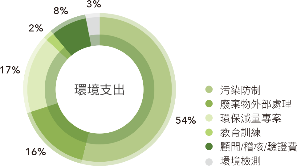 本公司積極投入環境管理,2024年環境支出總計新臺幣33,376仟元,項目涵蓋污染防治、廢棄物處理、環保減量、環境檢測等面向。超過50%用於污染防治,顯示我們對空氣、水與土壤保護的重視。廢棄物外部處理占17%,確保符合法規並妥善處理。環保減量專案則占17%,聚焦降低資源消耗與環境負擔。顧問、稽核與驗證費用,確保環境管理系統的有效運行。環境檢測,用於監測與改善環境績效。我們亦投入教育訓練,提升員工環保意識。透過這些努力,持續優化環境管理,邁向永續發展。