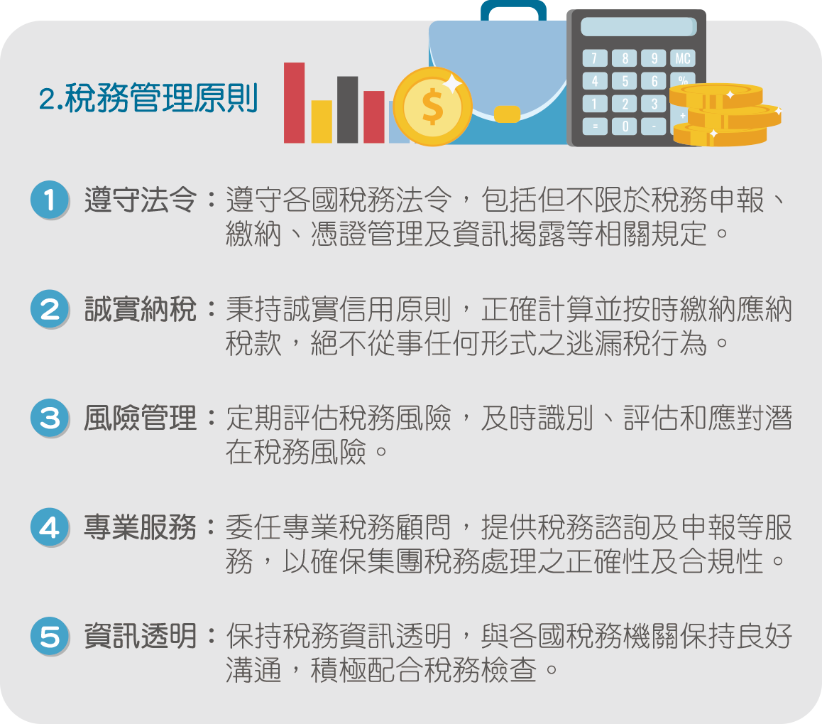 定期進行移轉訂價分析,準備三層文據之移轉訂價報告-「集團主檔報告(Master File)」、「本國事業報告(Local File)」及「國別報告(Country-by-Country Reporting)」,確保關係企業間之交易依常規交易原則,並積極了解稅務優惠政策,包括但不限於各項永續相關稅務優惠、降低整體稅負。 - 稅務管理原則