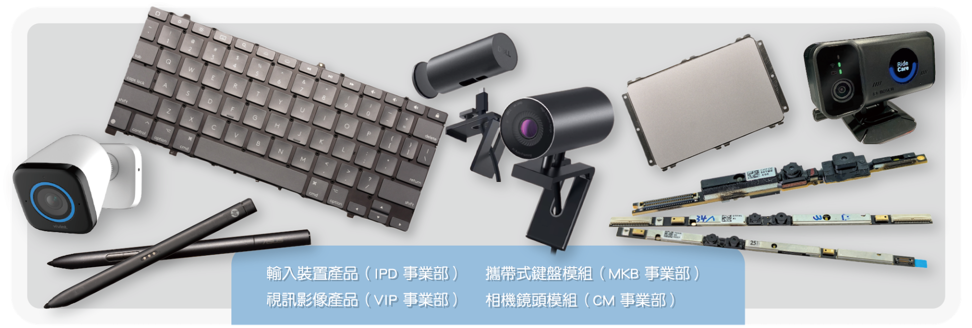 我們以電腦週邊產品、消費性視訊影像產品為事業發展根基,旗下四大產品線為輸入裝置產品、攜帶式鍵盤模組、視訊影像產品以及相機鏡頭模組,其中鍵盤、網路攝影機,及筆記型電腦相機模組已成為全球領導製造商,我們將完成的產品販售給下游組裝廠或者品牌廠等科技業龍頭。