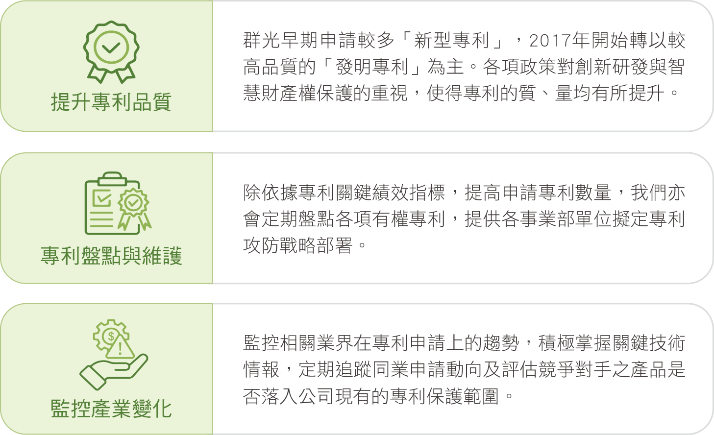 群光著重技術創新與智權發展,為保護公司之研發技術、累積智財成果,公司每年均制訂有「專利關鍵績效指標」,並鼓勵同仁提出高品質專利提案,以促進內部專利提案轉化為對外申請案之比率。