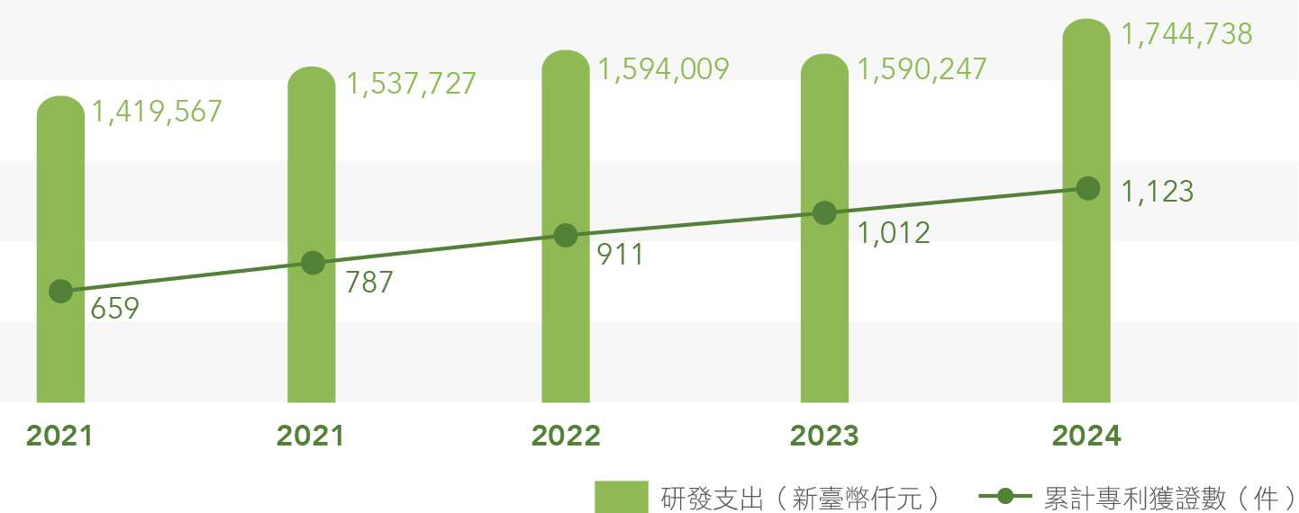 為維持市場競爭力,除擬定研發策略,群光亦持續投注研發資源,提供研發人員良好的工作環境與薪資福利,公司持續提升研發經費,2024年度已較2020年成長約22.5%,累計獲證專利數則較5年前大幅成長70.4%,持續入選專利發證與申請百大機構。未來也將持續挹注資源,鼓勵內部創新與外部合作,優化工作流程與產品的附加價值。