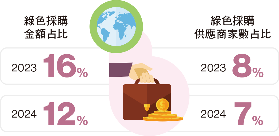 綠色採購金額比例 = 綠色採購總金額 ÷ 總採購金額 x 100%