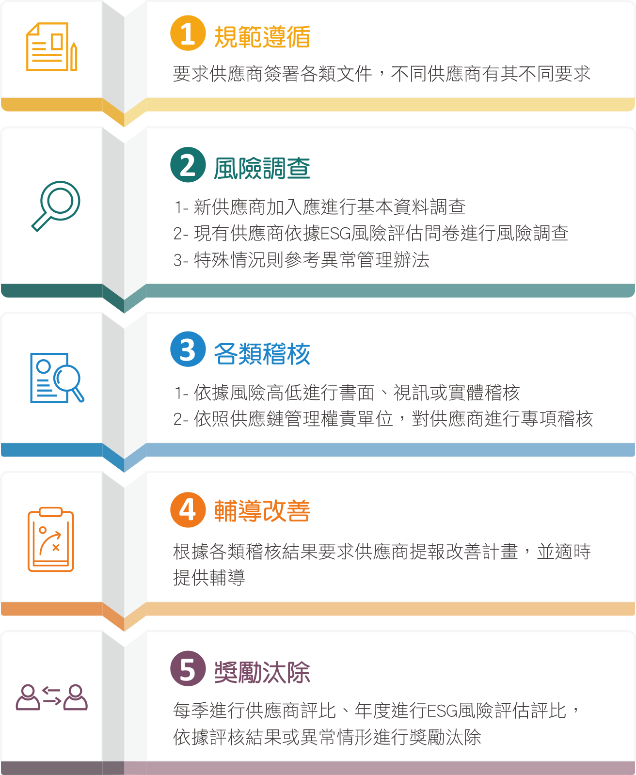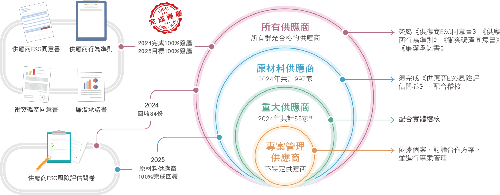 - 應簽署文件:《供應商ESG同意書》、《供應商行為準則》、《衝突礦產政策》、《廉潔承諾書》、《供應商ESG風險評估問卷》,2025年起新供應商若為原材料供應商才需回覆《供應商ESG風險評估問卷》